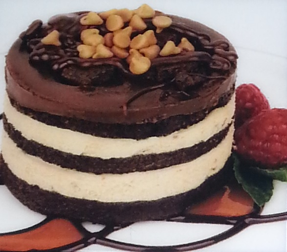 Peanut Butter lovers will explode with excitement after one bite! Fudge brownie bottom, layered in velvety smooth peanut butter mousse, chocolate cake, topped with brownie pieces and mini peanut butter chips!